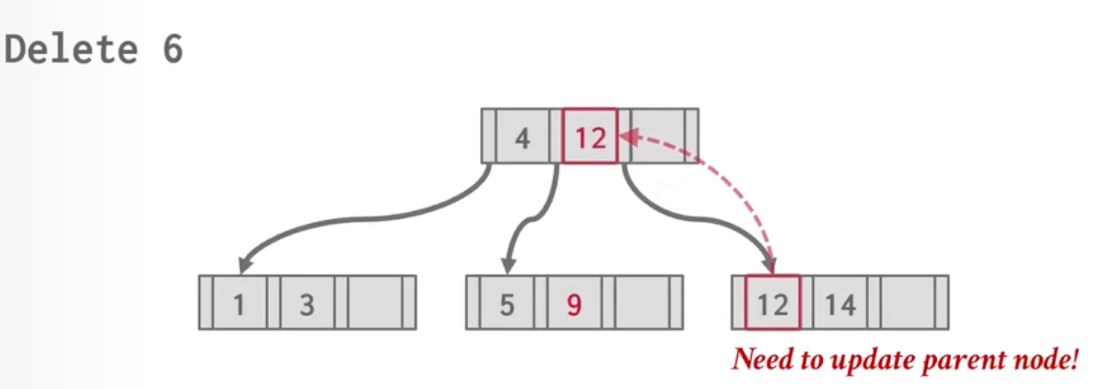 - 如果删除后叶子节点的条目数量依然有half-full,删除操作结束;