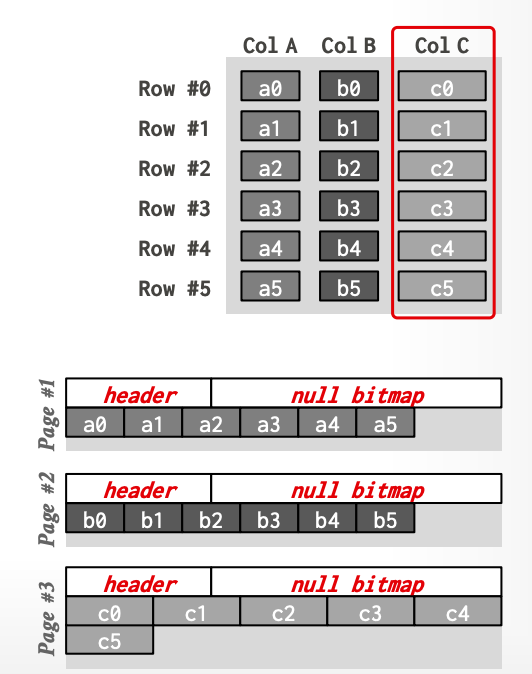 页内物理布局如图所示,header中依然是一些元数据。随后是所有元组的同一字段值连续存储在一起。