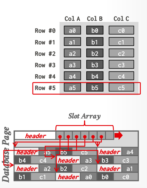 物理布局如图所示,每个元组拥有自己的header(其中包含例如空值bitmap之类的元数据),随后跟随元组所有属性值,因此一次读取可以获取整行数据,无需跳转其他页面。