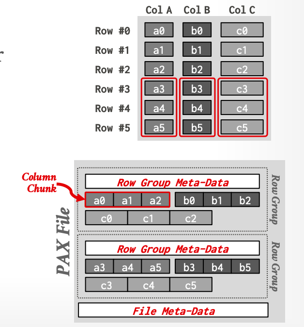 注意:行组大小与之前所说的页面并不相同,一般认为PAX file是用于分析的不可变文件,因此行组大小设置的较大,Parquet中默认行组大小为128M;ORC固定为100w个元组。